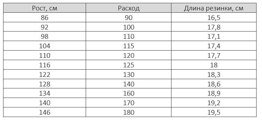 Ориентировочная длина резинки для манжеты на рукавах, для более точных размеров необходимо ориентироваться на охват руки ребенка, плюс 3 см (2 см на сшивание резинки, 1 см на свободу):